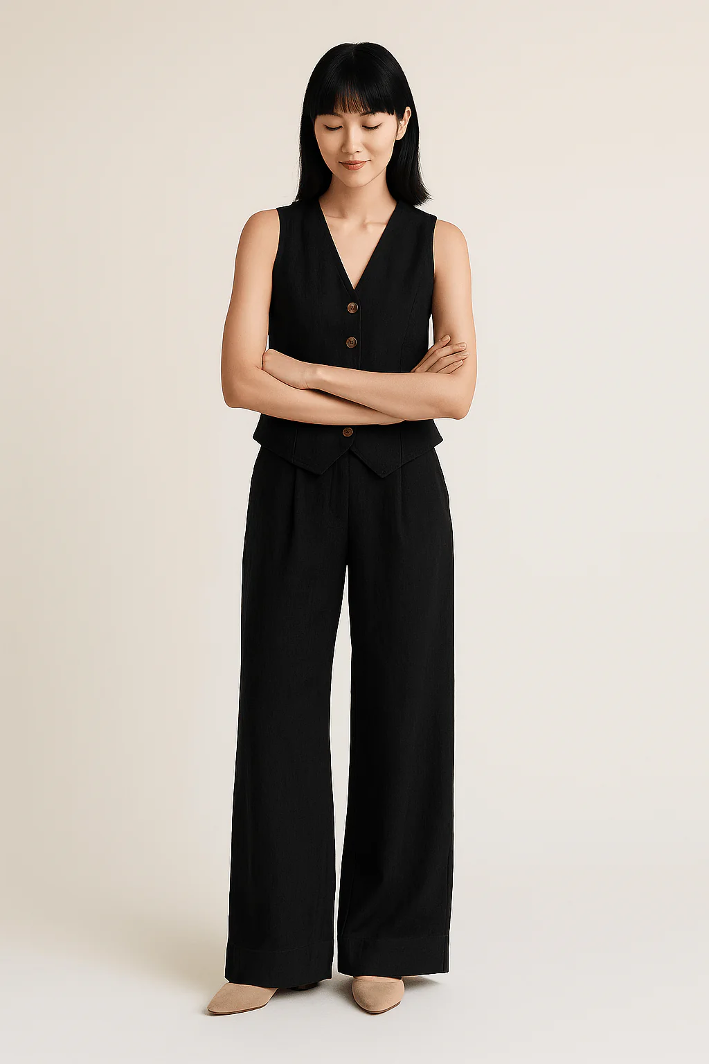 Add the Yveline Linen Vest & Wide‑Leg Trousers Set to your wardrobe – the holistic high‑impact option for polished, relaxed elegance.